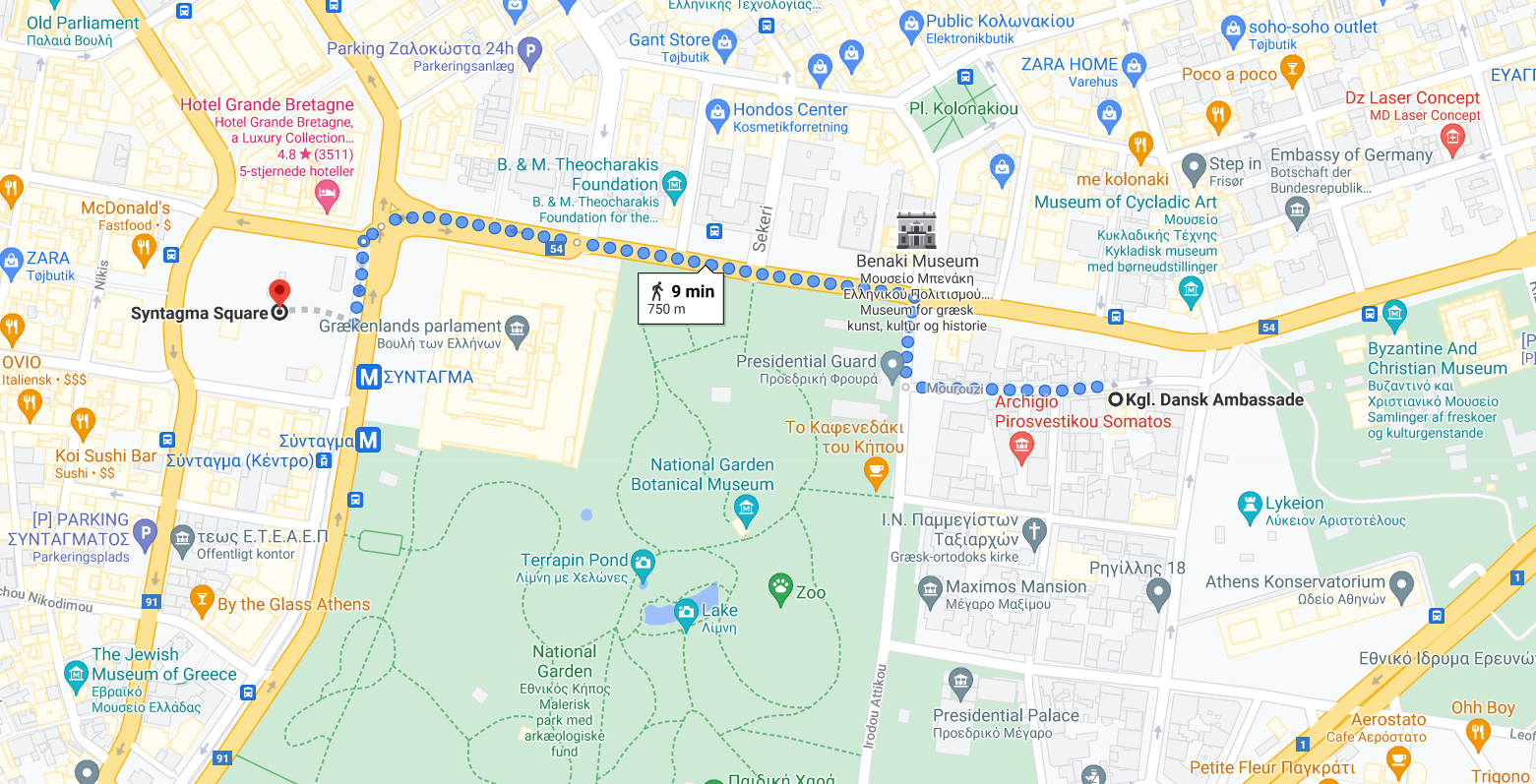 Rutevejledning til ambassaden fra Syntagma Square