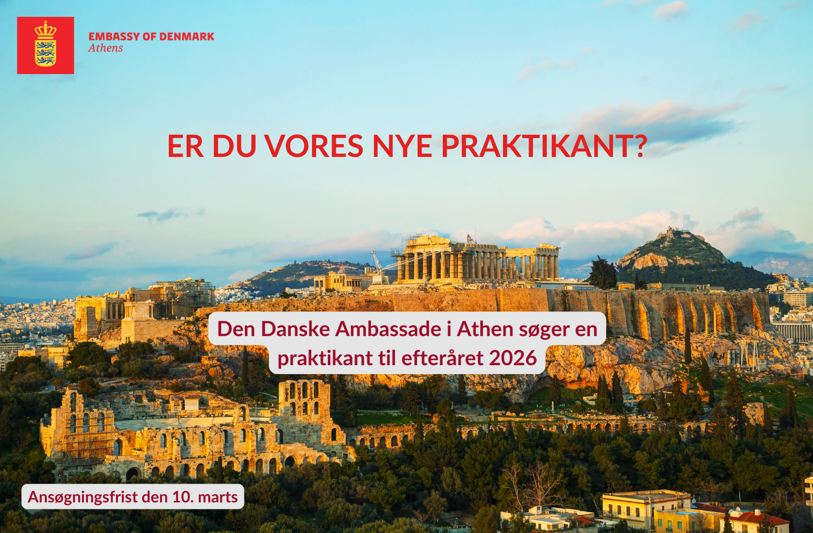 Den danske ambassade i Athen søger en engageret, ambitiøs og politisk-økonomisk interesseret praktikant til at tage del i ambassadens arbejde i efteråret 2026. Praktikopholdet vil give dig et unikt indblik i dansk diplomati, og du vil blive udfordret både fagligt, socialt og kulturelt samt få mulighed for at afprøve dine kompetencer i praksis på en spændende arbejdsplads i en af Europas mest interessante og historiske storbyer. Som geografisk port til Europa er der stor opmærksomhed omkring ambassadens arbejde, hvor særligt udviklingen på migrationsområdet og den økonomiske reformindsats i kølvandet på mange års økonomisk krise præger den daglige arbejdsgang. Ambassaden dækker også Cypern.